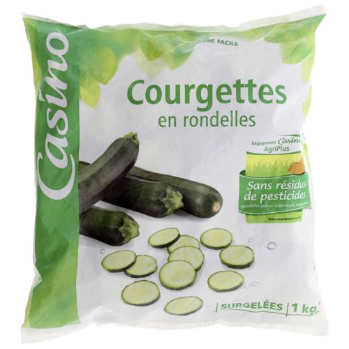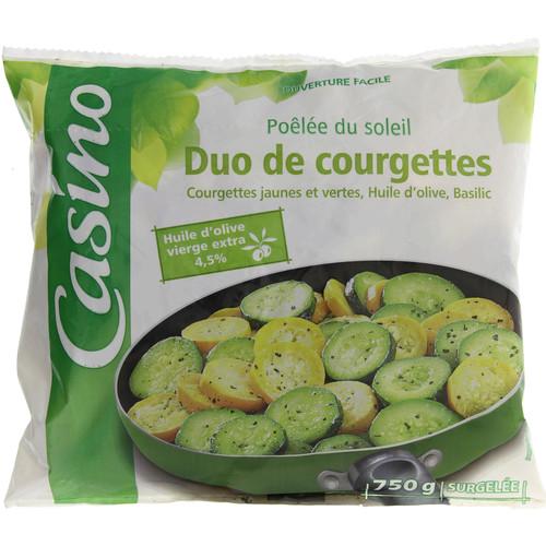 Courgettes vertes et jaunes enrobées d'une sauce à base d'huile d'olive vierge extra 4.5% et de basilic, surgelées. Ingrédients : Courgettes vertes et jaunes 93.8%...