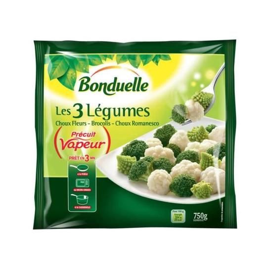 Mélange de légumes surgelés. Ingrédients : choux fleurs (50%), brocolis (40%), choux roman (10910). Traces possibles de celeri. Quantité : 750 g Marque : Bonduelle...