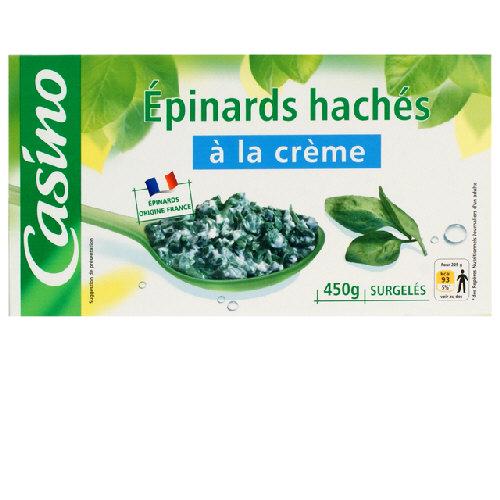 Epinards hachés à la crème fraîche en portions surgelés. Ingrédients : Epinards hachés origine france 68% - eau - _crème_ fraîche 7% - _lait_ écrémé...