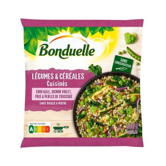 Légumes et céréales cuisinés. Ingrédients : chou palmier (kale) 16%, graines de _couscous_ cuites (eau, farine de _blé_ tendre) 16%, oignons violets grillés 15%, petits...
