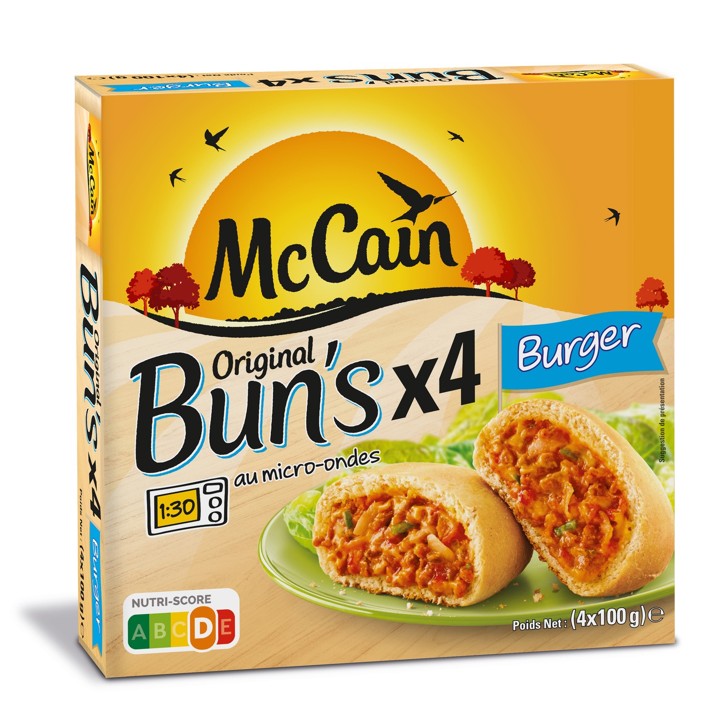 Original Bun's - Burger. Ingrédients : Farine de blé, fromages (15,5%) [cheddar (colorant : rocou), mozzarella], eau, viande de b?uf (10%), ketchup (8%) [tomates, vinaigre,...