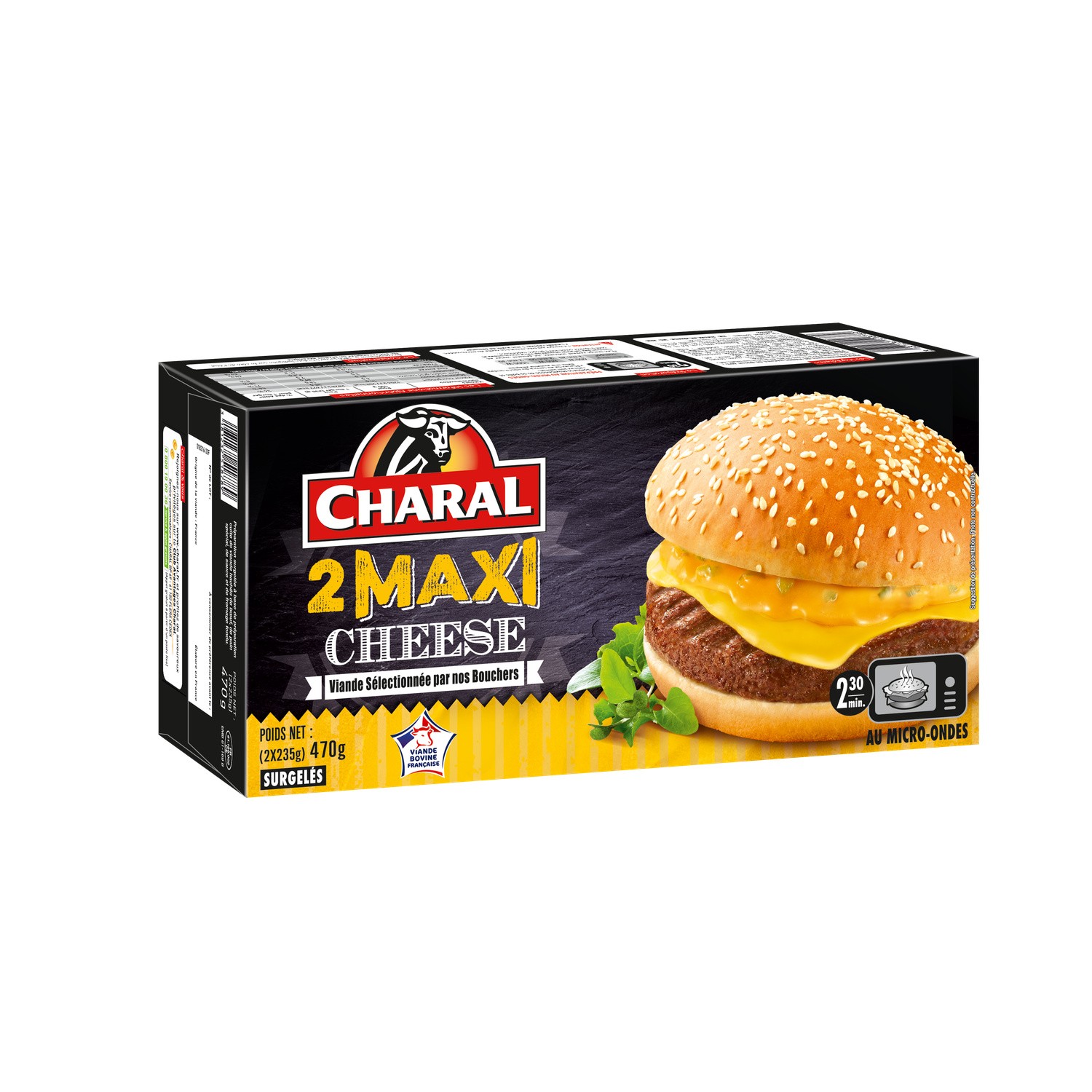 Maxi cheese. Marque : CharalIngrédients Préparation cuite de viande hachée de bœuf 40 % : viande de bœuf 99.3 % (soit 39,8 % du produit fini...