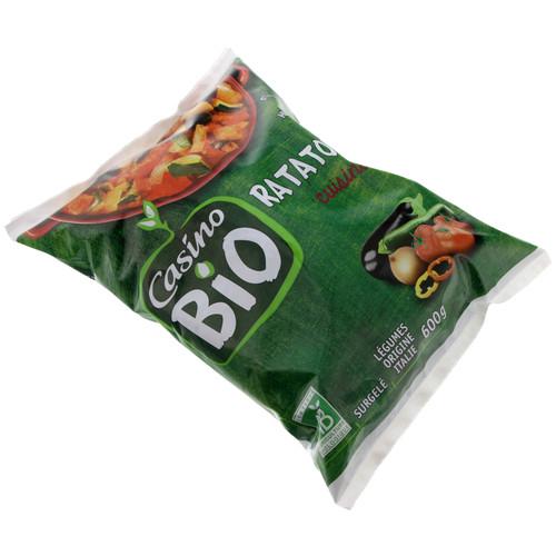 Ratatouille cuisinée à l'huile d'olive vierge extra 2,2%, surgelée, issue de l'agriculture biologique. Ingrédients : Tomates pelées* (origine Italie) 21,6% - courgettes grillées* (origine Italie)...