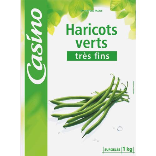 Haricots verts très fins surgelés. Ingrédients : 100% Haricots verts très fins. Quantité : 1 kg Marque : Casino