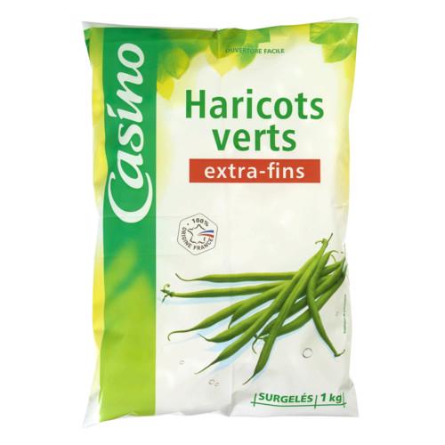 Haricots verts extra-fins surgelés. Ingrédients : 100% haricots verts extra-fins origine France. Quantité : 1 kg Marque : Casino Origine : France