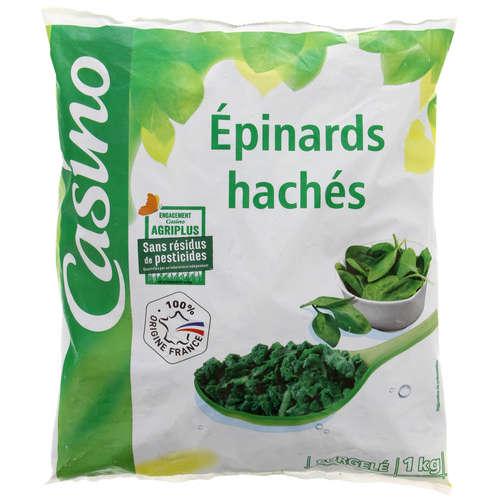 Epinards hachés en portions surgelés. Ingrédients : 100 % épinards hachés origine France Quantité : 1 kg Marque : Casino