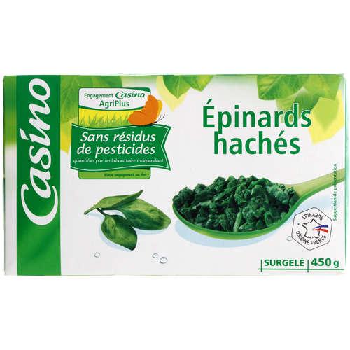 Epinards hachés en portions surgelés. Ingrédients : 100% épinards hachés origine France Quantité : 450 g Marque : Casino