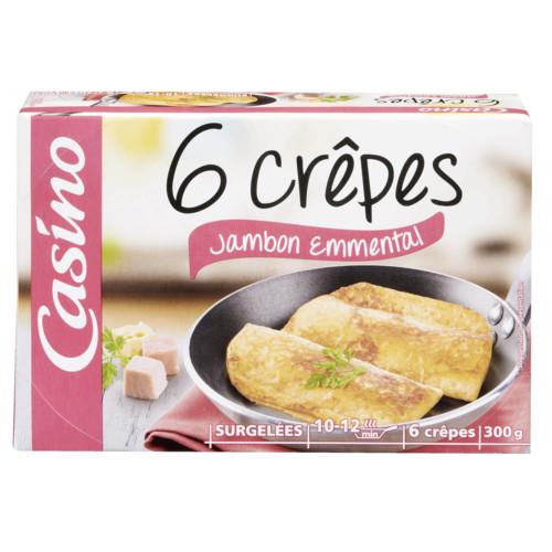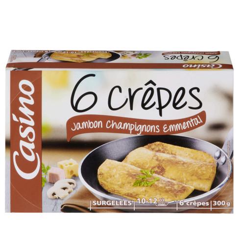 6 crêpes au jambon, aux champignons de Paris et à l'emmental surgelées. Ingrédients : Eau - farine de _blé_ - jambon cuit standard 8% (jambon...