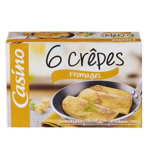 6 crêpes aux fromages surgelées. Ingrédients : Eau - farine de _blé_ - _emmental_ 7,5% - _oeufs_ frais - l_actose_ et protéines de _lait_ -...
