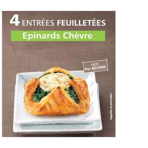 Pâte feuilletée crue garnie d'une préparation à base d'épinards et de fromage de chèvre, surgelée. Ingrédients : Pâte feuilletée 50% : farine de _blé_ -...