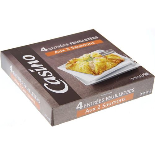 Pâte feuilletée crue garnie d'une préparation à base de saumon et de saumon fumé, surgelée. Ingrédients : Eau - farine de _blé_ - _saumon_ (Salmo...