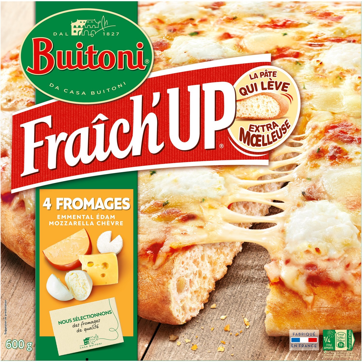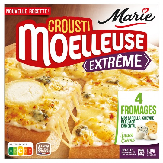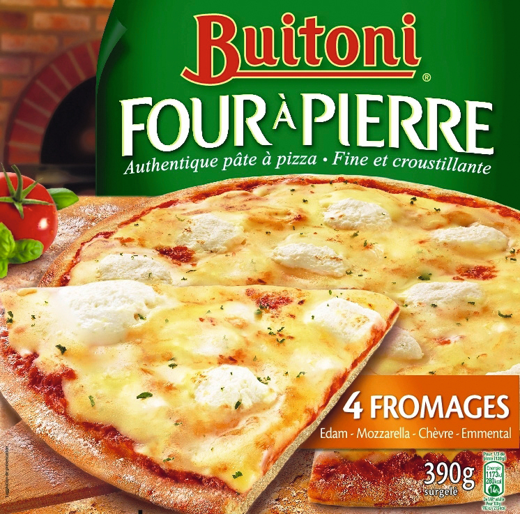 Four à Pierre 4 Formaggi. Ingrédients : Garniture (60,5%) : fromages (édam (18,6%)* mozzarella (12%)* chèvre (3,4%)* emmental (1,2%), eau, purée de tomates (8%), amidon...