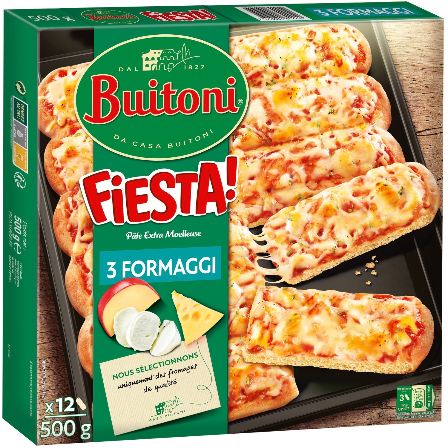 Fiesta Pizza 3 Fromages. Ingrédients : Pâte (54 %): farine de _blé_, eau, huile de tournesol, levain de _seigle_ et de _blé_ (_soja_), levure boulangère,...