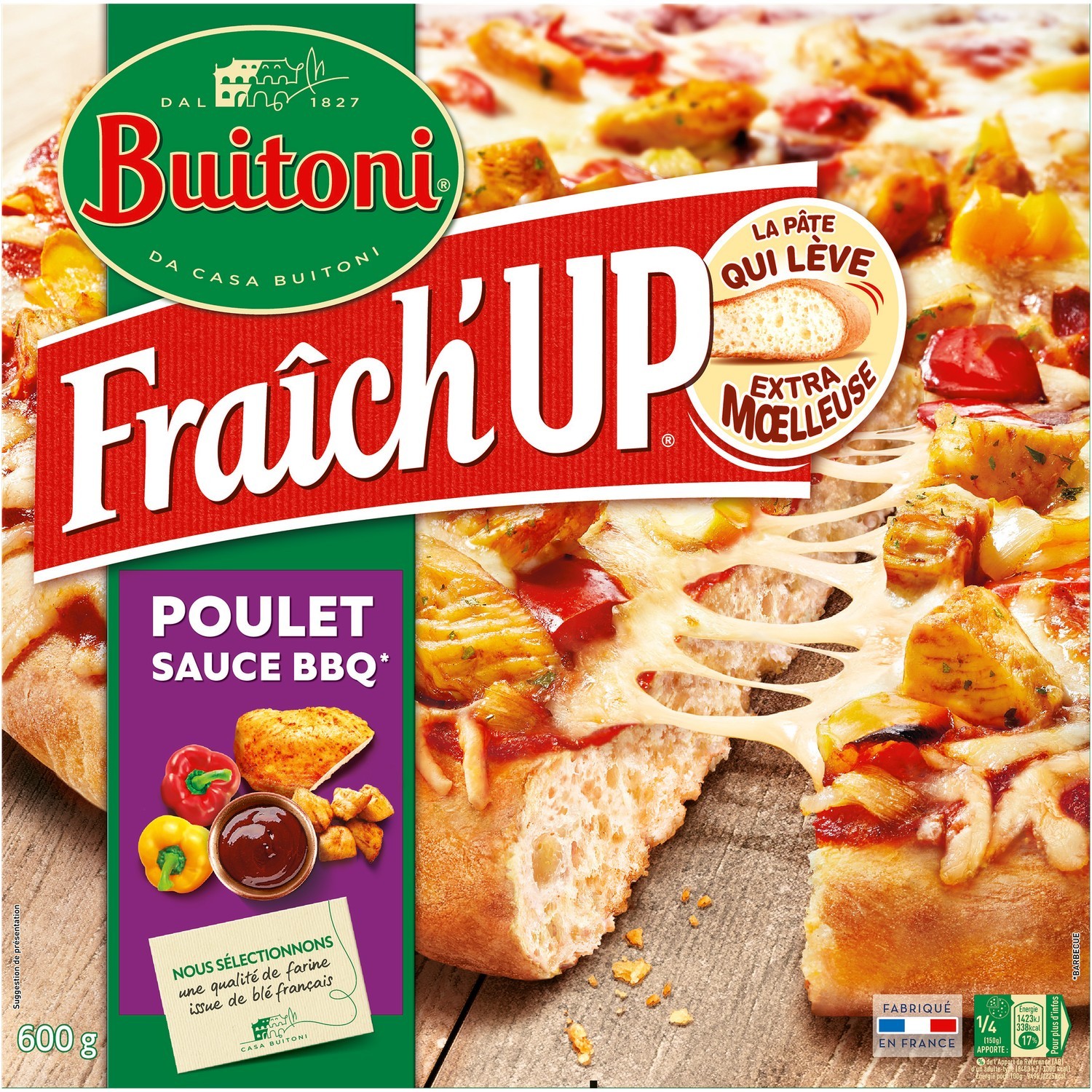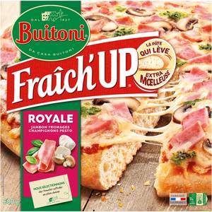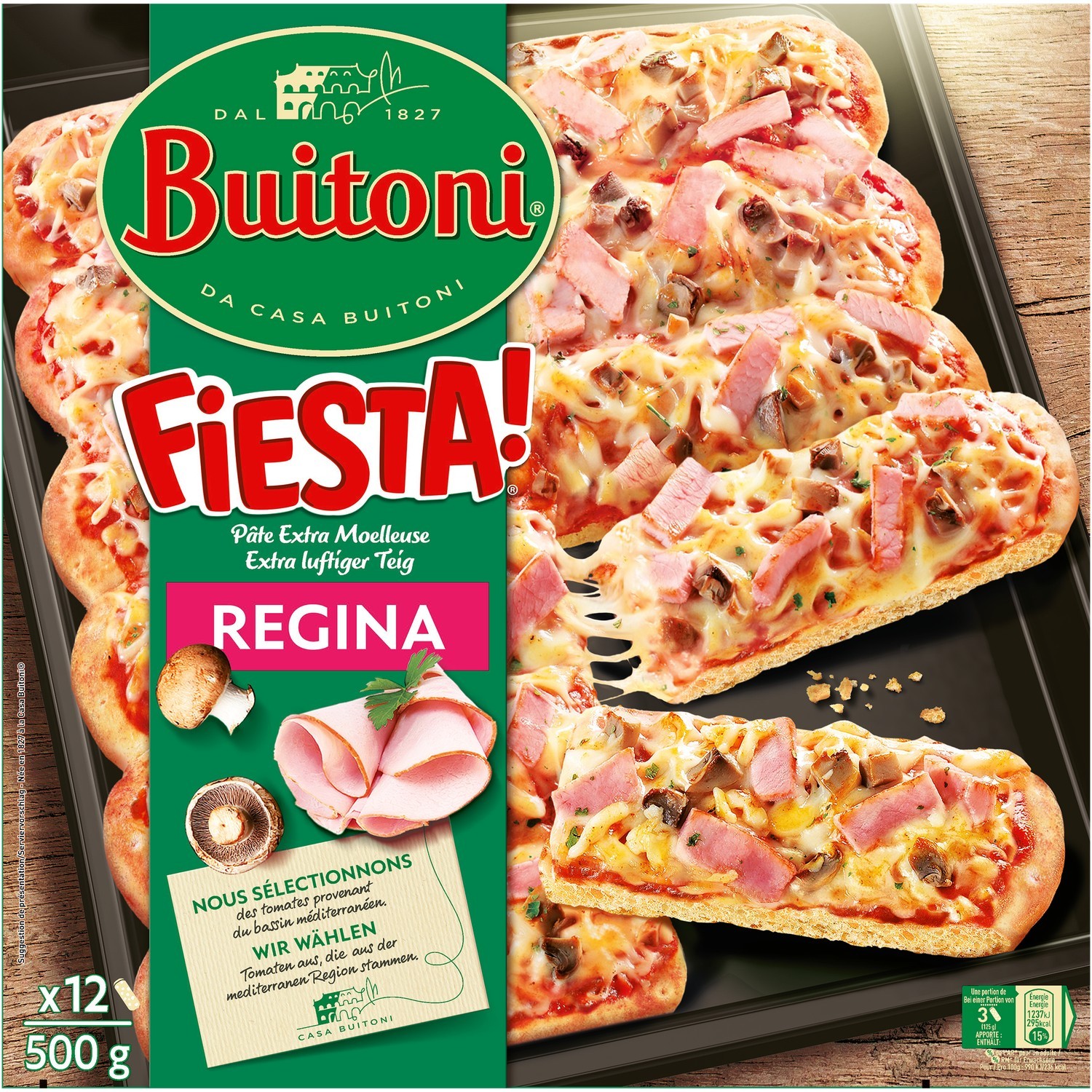 Pizza Fiesta Regina. Ingrédients : Pâte (52%) : farine de _blé_, eau, huile de tournesol, levain de _seigle_ et de _blé_ (_soja_), levure boulangère, chapelure...