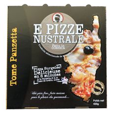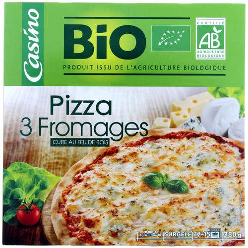 Pizza cuite au feu de bois, garniture à base d'emmental, de mozzarella et de gorgonzola, issue de l'agriculture biologique surgelée. Ingrédients : Farine de _blé_*...