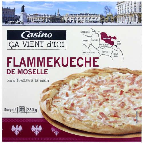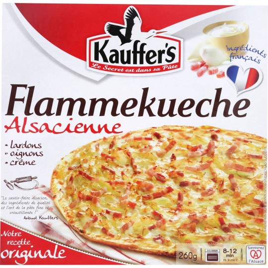 Tarte à pâte fine crue garnie de crème fraîche, de lardons fumés et d'oignons surgelée. Ingrédients : _crème_ fraîche épaisse 34,6% [_crème_ - ferments lactiques...