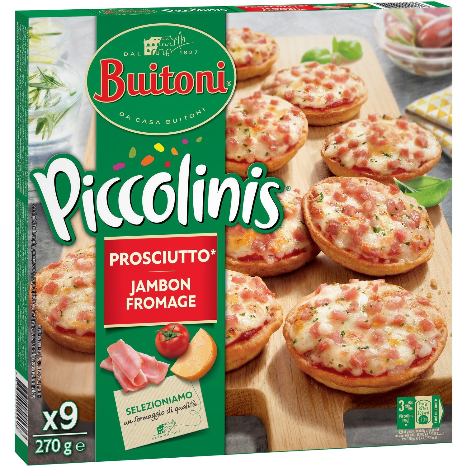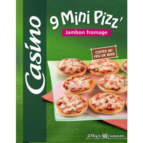 9 Mini pizzas à l'edam et au jambon cuit supérieur, cuites au feu de bois, surgelées. Ingrédients : Farine de _blé_ - purée de tomates...