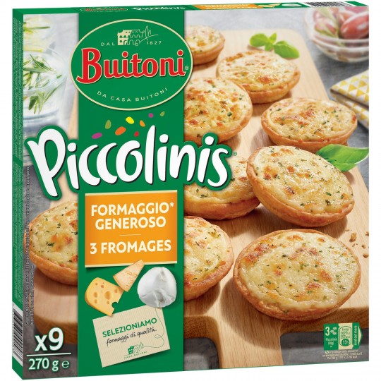 Piccolinis 3 Formaggi - Mini Pizzas 3 Fromages. Ingrédients : Farine de _blé_, _fromages_ (25%) (_mozzarella_, _emmental_, _fromage_ à pâte dure), _crème_, eau, huile de...