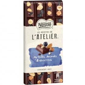 Chocolat noir aux myrtilles confites, noisettes et amandes. Ingrédients : Pâte de cacao (Afrique de l'Ouest, Équateur), sucre, amandes 6.2 %, noisettes 6.2 %, myrtilles...