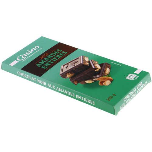 Chocolat noir aux amandes entières. Ingrédients : Pâte de cacao - sucre - _amandes_ entières 25% - matière grasse de lait anhydre - émulsifiant: lécithine...