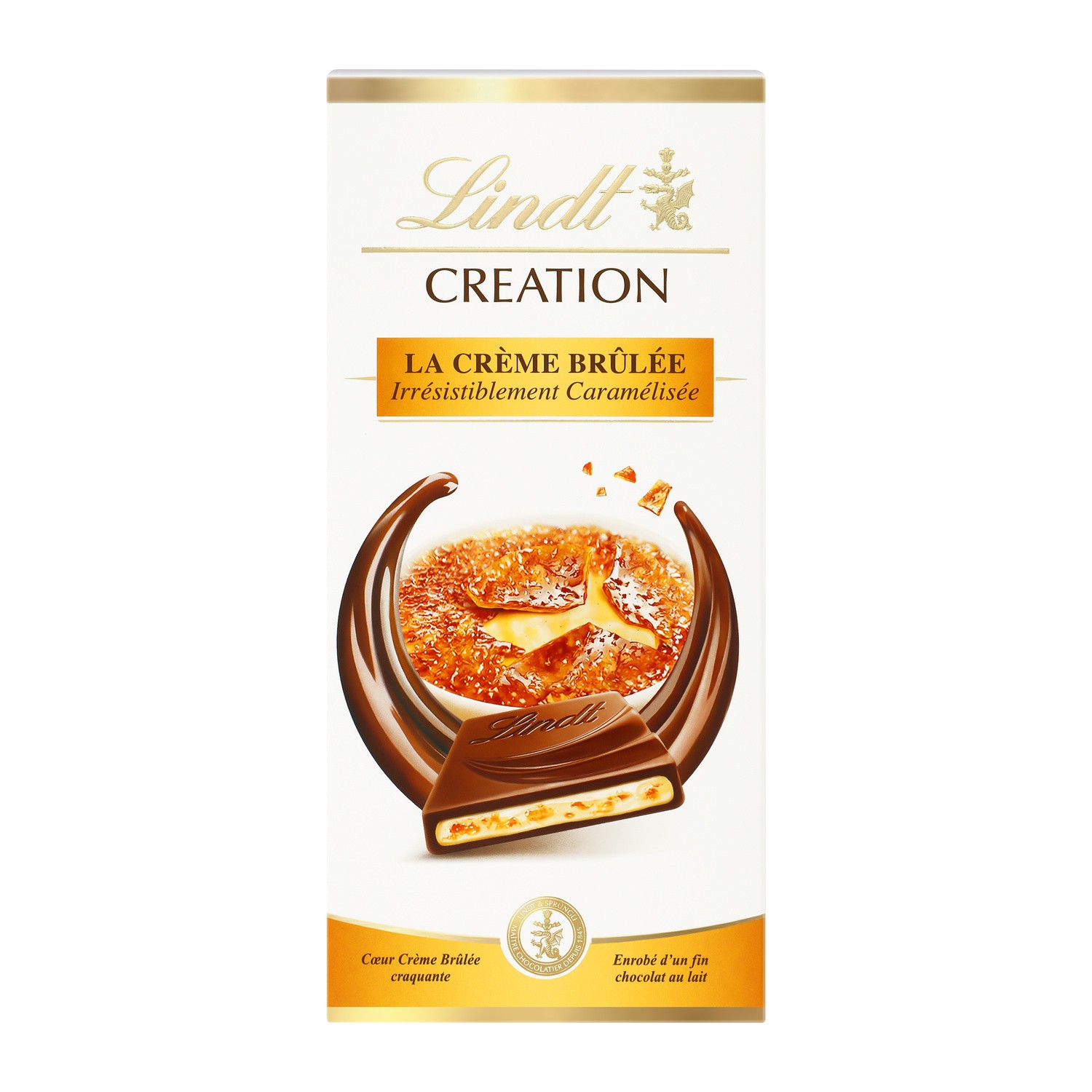 Création crème brulée. Ingrédients : Sucre, beurre de cacao, poudre de _lait_ 15 %, beurre _laitier_ concentré 9 %, pâte de cacao, _lactose_, sucre caramélisé...