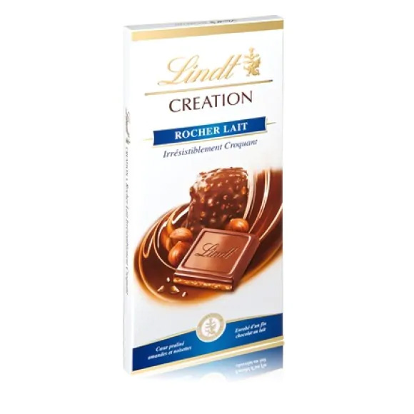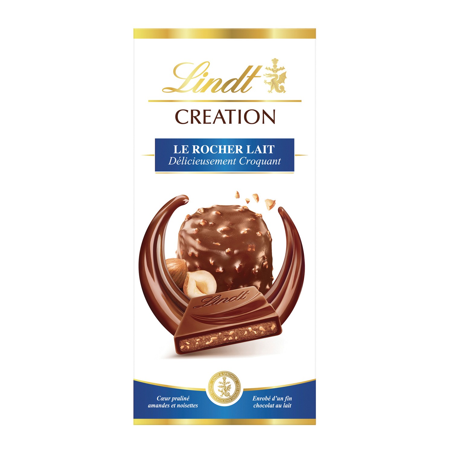 Le rocher lait. Ingrédients : sucre, beurre de cacao, poudre de _lait_, praliné aux _amandes_ et aux _noisettes_ (sucre, _amandes_, _noisettes_) 11%, pâte de cacao,...