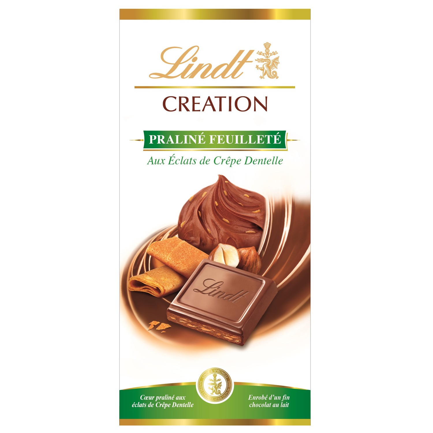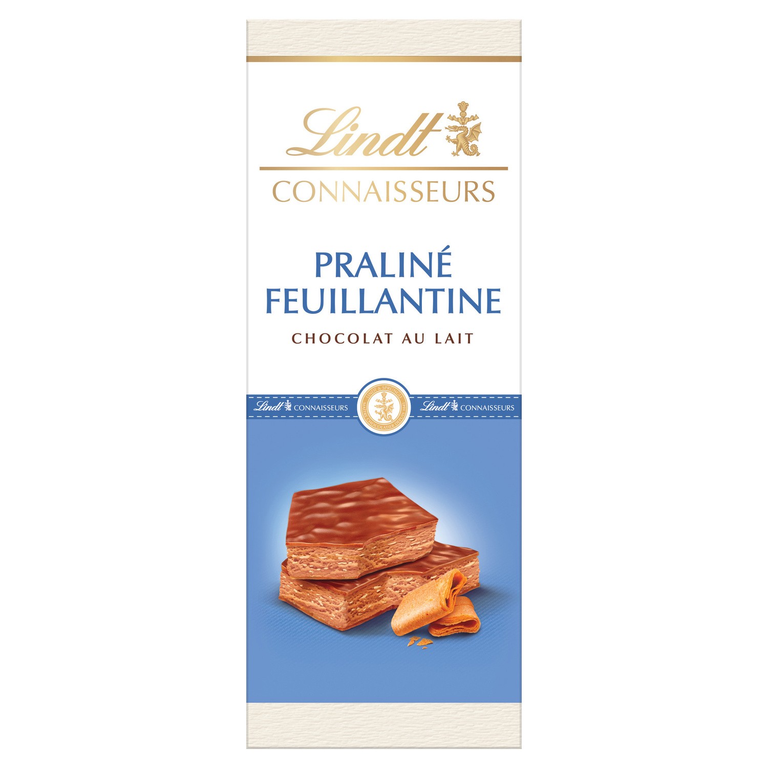 Chocolat au lait, extra fin, fourré aux pralinés amandes et noisettes et aux éclats de crêpe dentelle. Ingrédients : Sucre, praliné aux _amandes_ et aux...