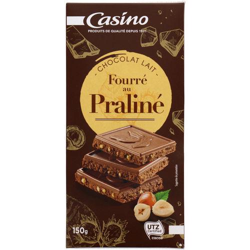 Chocolat supérieur au lait fourrage au praliné et aux éclats de noisettes caramélisés. Ingrédients : Chocolat au lait 52% [sucre - beurre de cacao -...