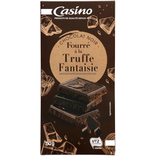Chocolat noir fourrage à la truffe fantaisie et aux éclats de fèves de cacao caramélisés. Ingrédients : Chocolat noir 52% [sucre - pâte de cacao...