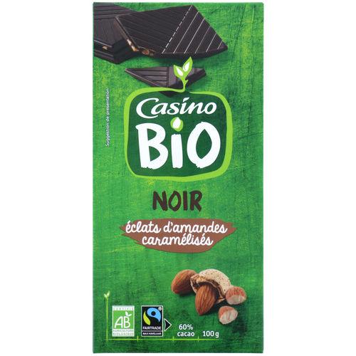 Chocolat noir supérieur aux éclats d'amandes caramélisés (12%) issu de l'agriculture biologique. Ingrédients : Pâte de cacao* - sucre* - éclats d'_amandes_ 8.4%* - beurre...