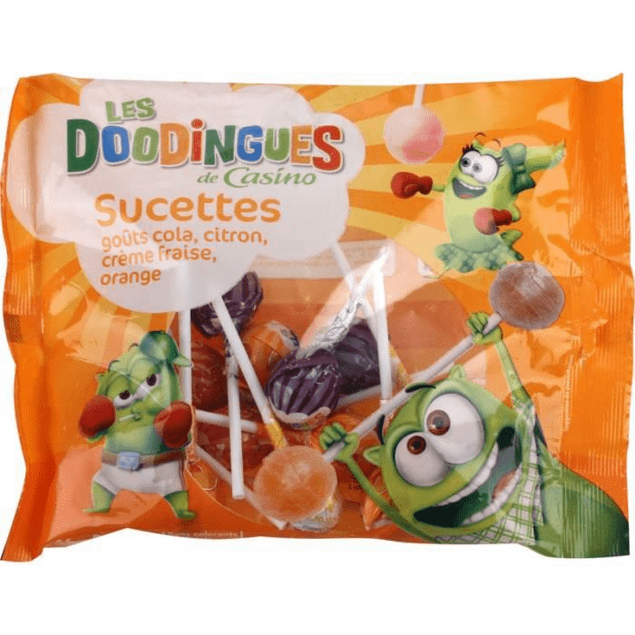 Assortiment de sucettes aux arômes : citron, cola, crème fraise et orange. Ingrédients : Sucre - sirop de glucose - acidifiants : acide citrique, acide...