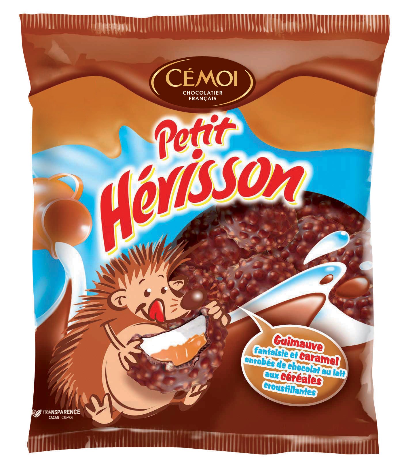 Guimauve fantaisie et caramel enrobés de chocolat au lait aux céréales.. Ingrédients : Sirop de glucose-fructose, sucre, caramel 16 % Ingrédients (sirop de glucose, graisse...