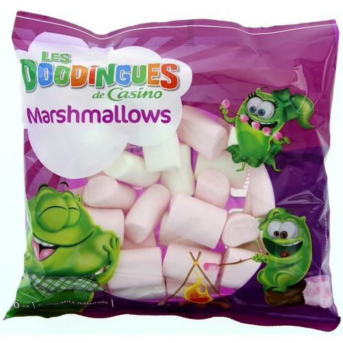 Chamallows. Ingrédients : Sirop de glucose; sucre; eau; humectant: sirop de sorbitol; gélatine; dextrose; amidon; concentrés de fruits et de plantes: betterave rouge, carthame; arôme...