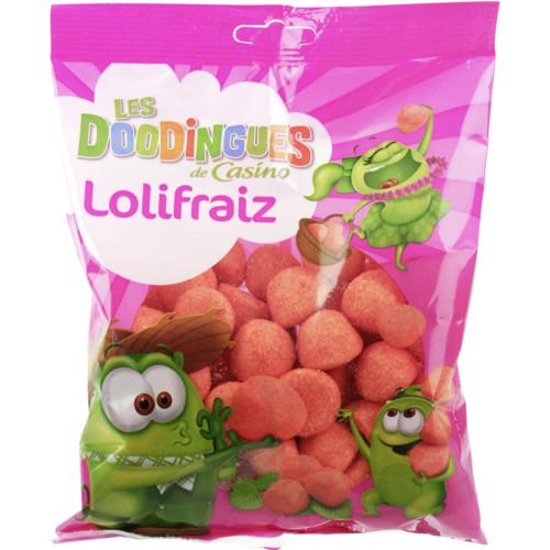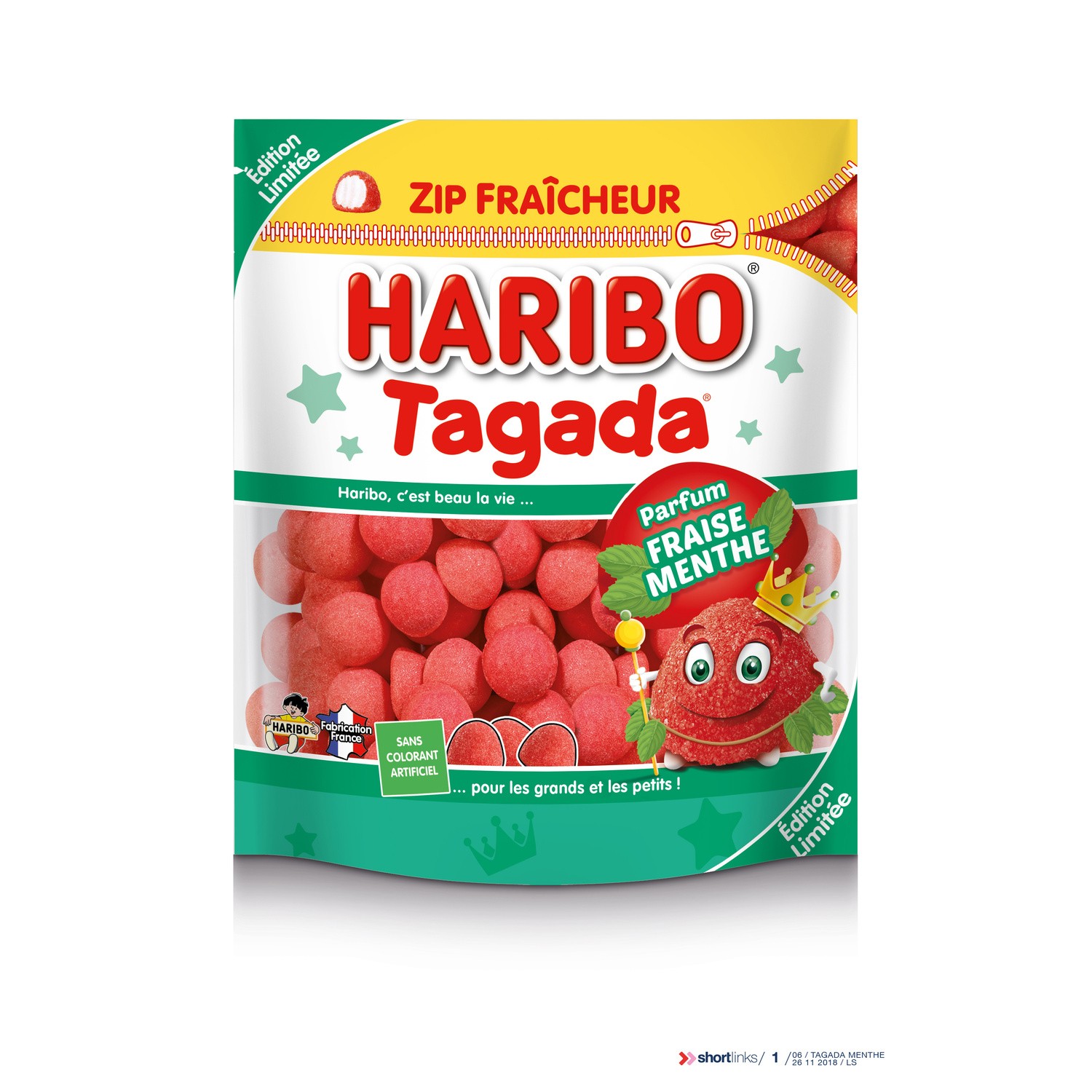 Haribo tagada Parfum fraise menthe. Ingrédients : sucre; sirop de glucose; gélatine; acidifiant: acide citrique; arôme; concentrés de fruits et de plantes: radis, carotte, carthame,...