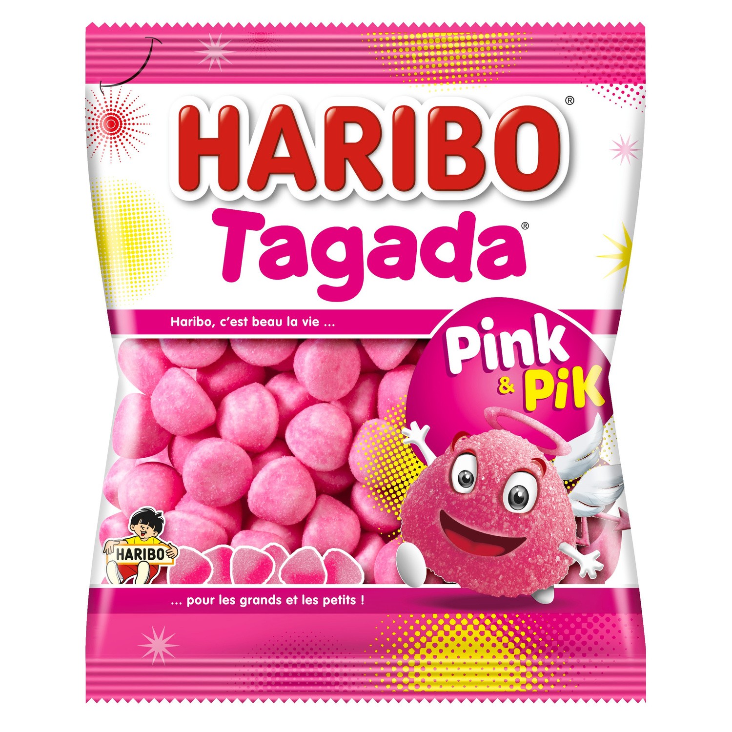 Tagada pink. Ingrédients : sucre; sirop de glucose; gélatine; acidifiants: acide citrique, acide malique; correcteur d'acidité: malate acide de sodium; arôme; concentrés de fruits et...