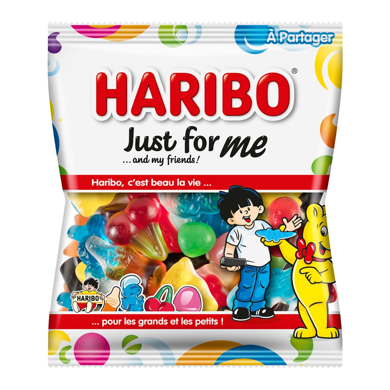 Haribo Schtroumpfs. Ingrédients : sirop de glucose; sucre; gélatine; dextrose; acidifiant: acide citrique; arôme; concentrés de fruits et de plantes: spiruline, carthame, citron, carotte; sirop...