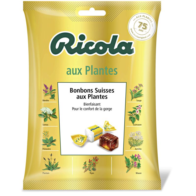 Bonbons suisses au plantes. Ingrédients : sucre, sirop de glucose, extrait (1 %) du mélange de 13 plantes Ricola : plantain, guimauve, menthe, thym, sauge,...