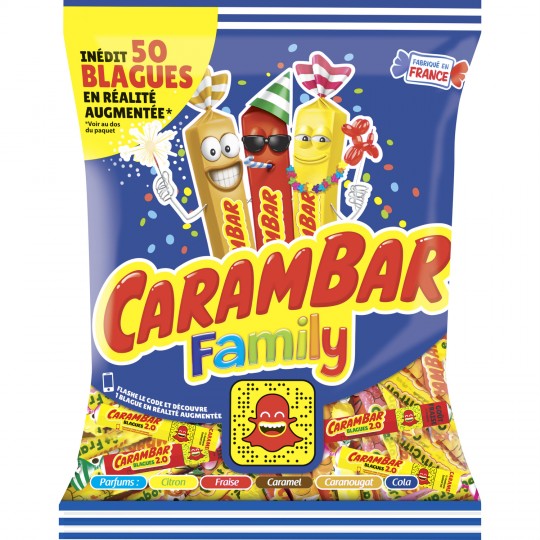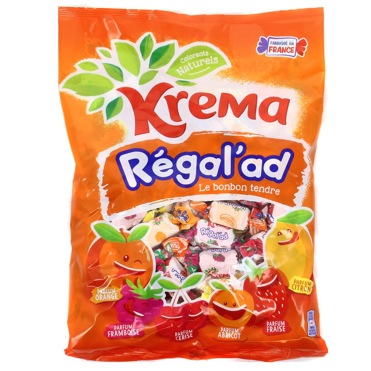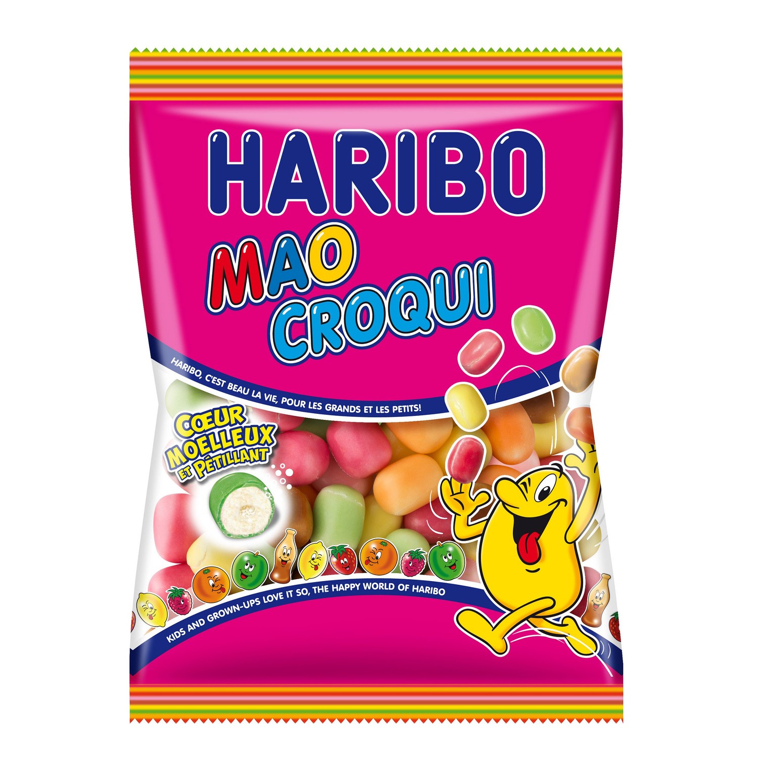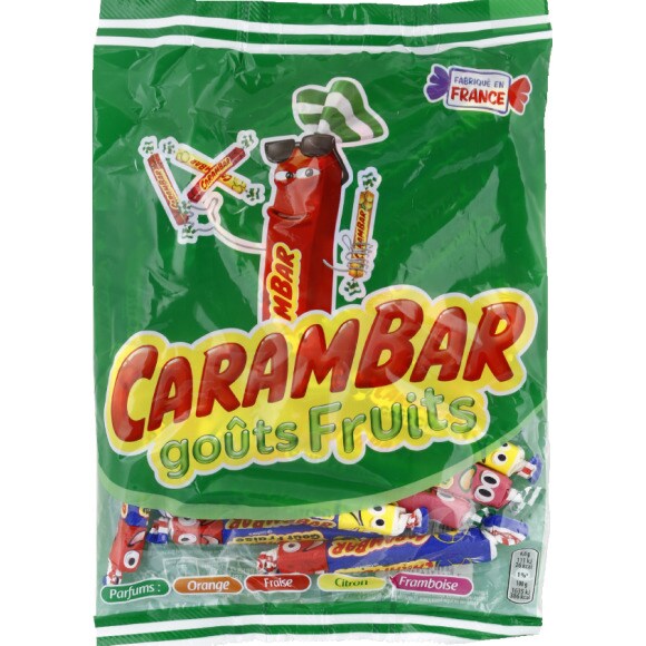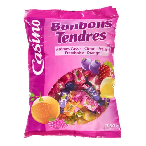 Bonbons tendres. Ingrédients : Sucre, sirop de glucose, huile de palme, gélatine, acidifiant (acide citrique), arômes, jus de fruits concentrés, colorants (E160c, E161b), émulsifiant (lécithine...