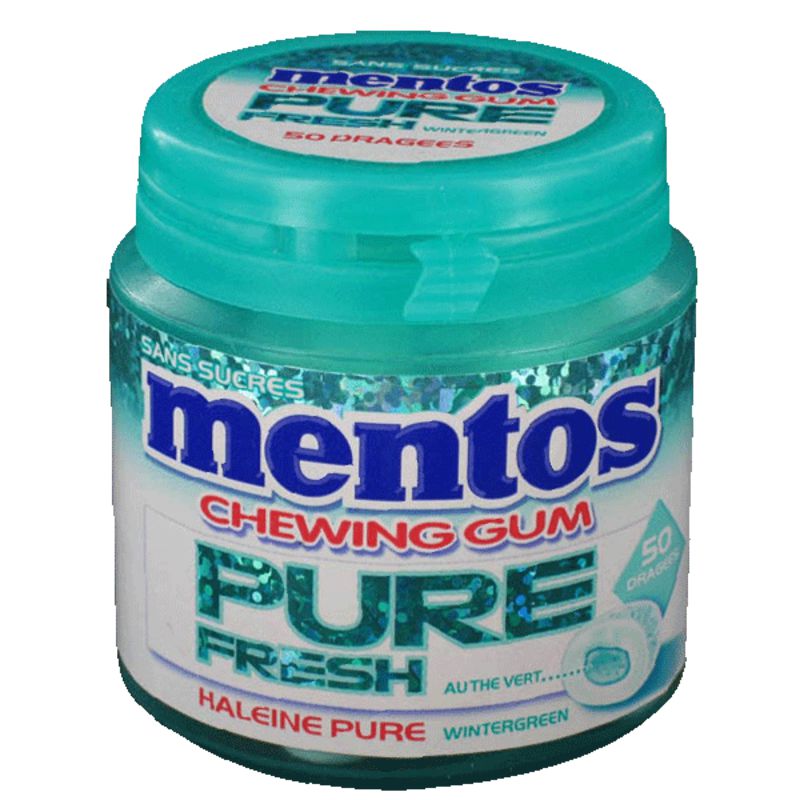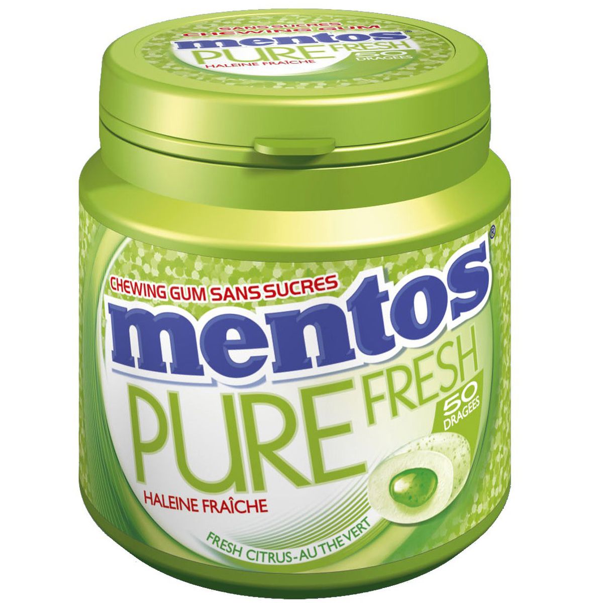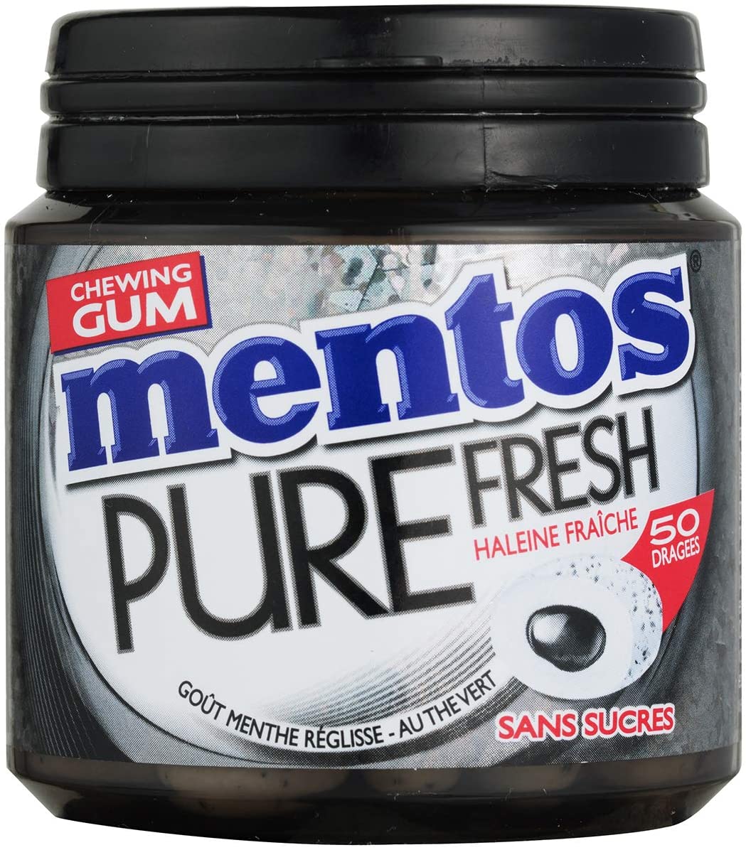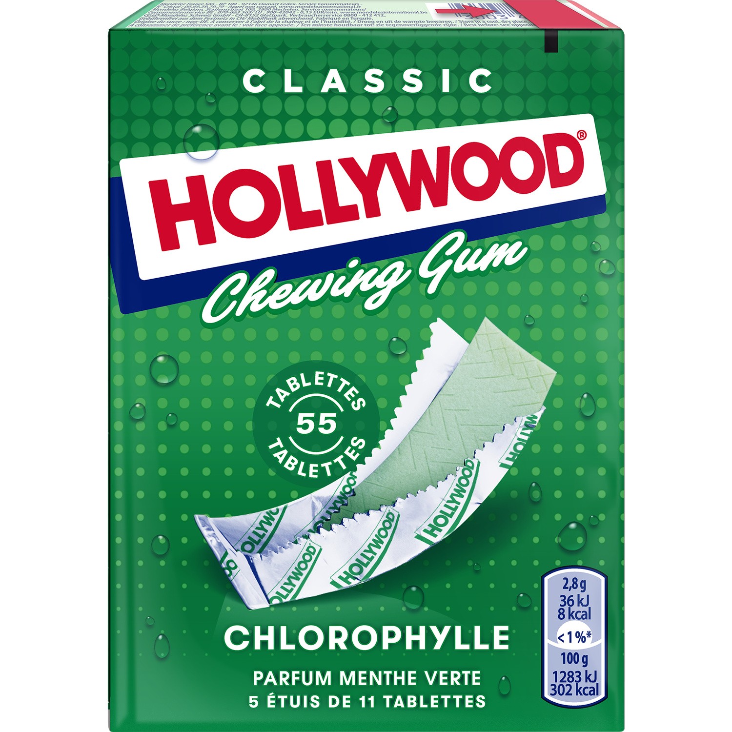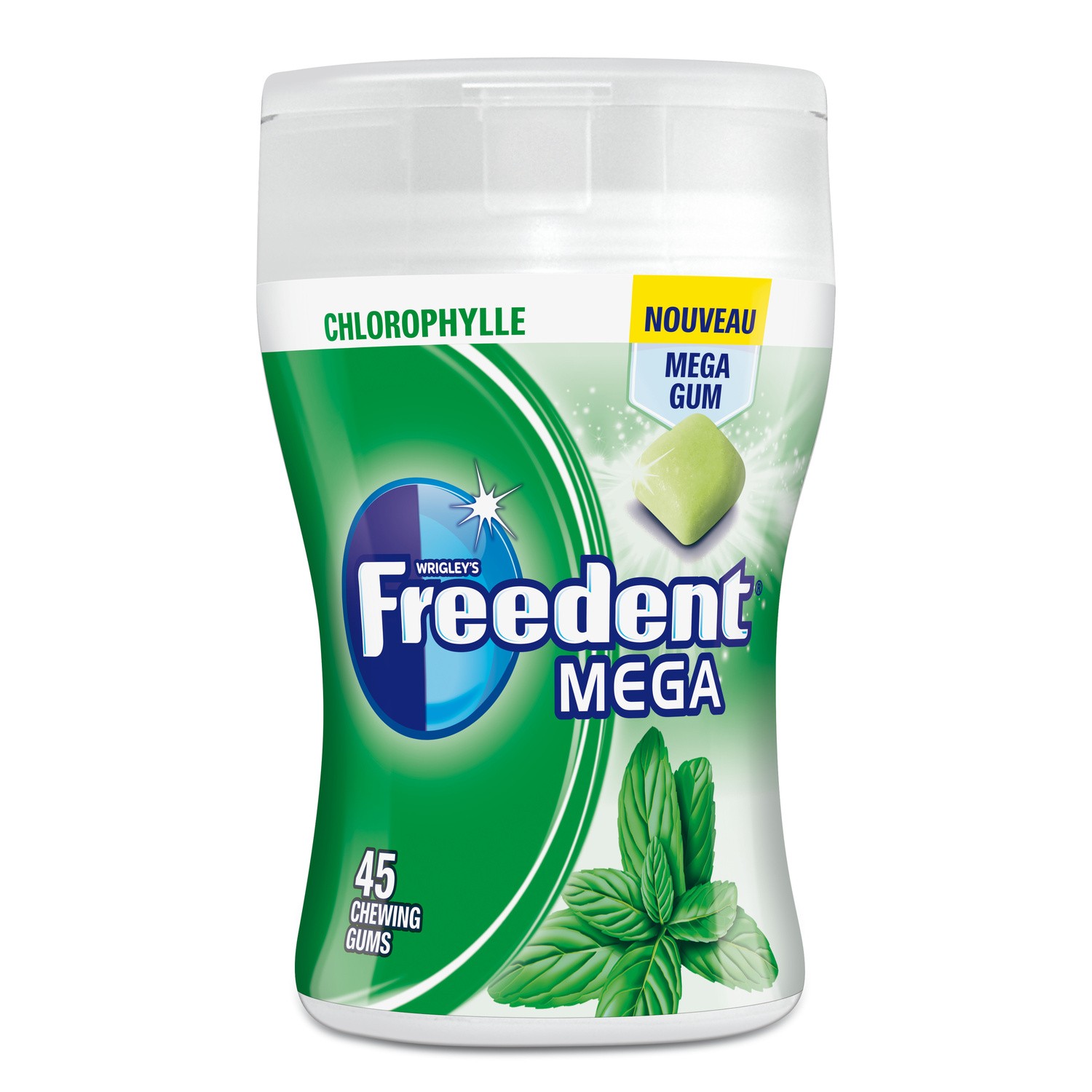 Chewing-gum avec édulcorants parfum chlorophylle. Ingrédients : Édulcorants (xylitol, sorbitol, mannitol, sirop de maltitol, aspartame, acésulfame-K), gomme base, stabilisant (glycérol), maltodextrine, arômes, fécule, émulsifiants (sucroesters...
