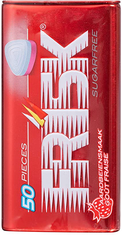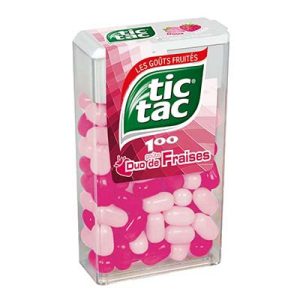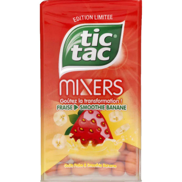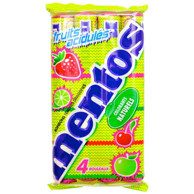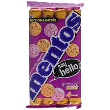 Mentos (Say Hello). Ingrédients : sucre, sirop de glucose, jus de fruits (orange, framboise) (2%), huile de noix de coco totalement hydrogénée, acidifiant (acide citrique),...