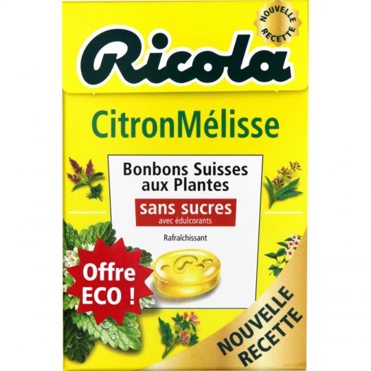 Bonbons citron mélisse sans sucres. Ingrédients : Isomalt. acidifiant (acide citrique), extrait (0,3%) de mélisse citronnelle et du mélange de 13 plantes Ricola, arôme natu...