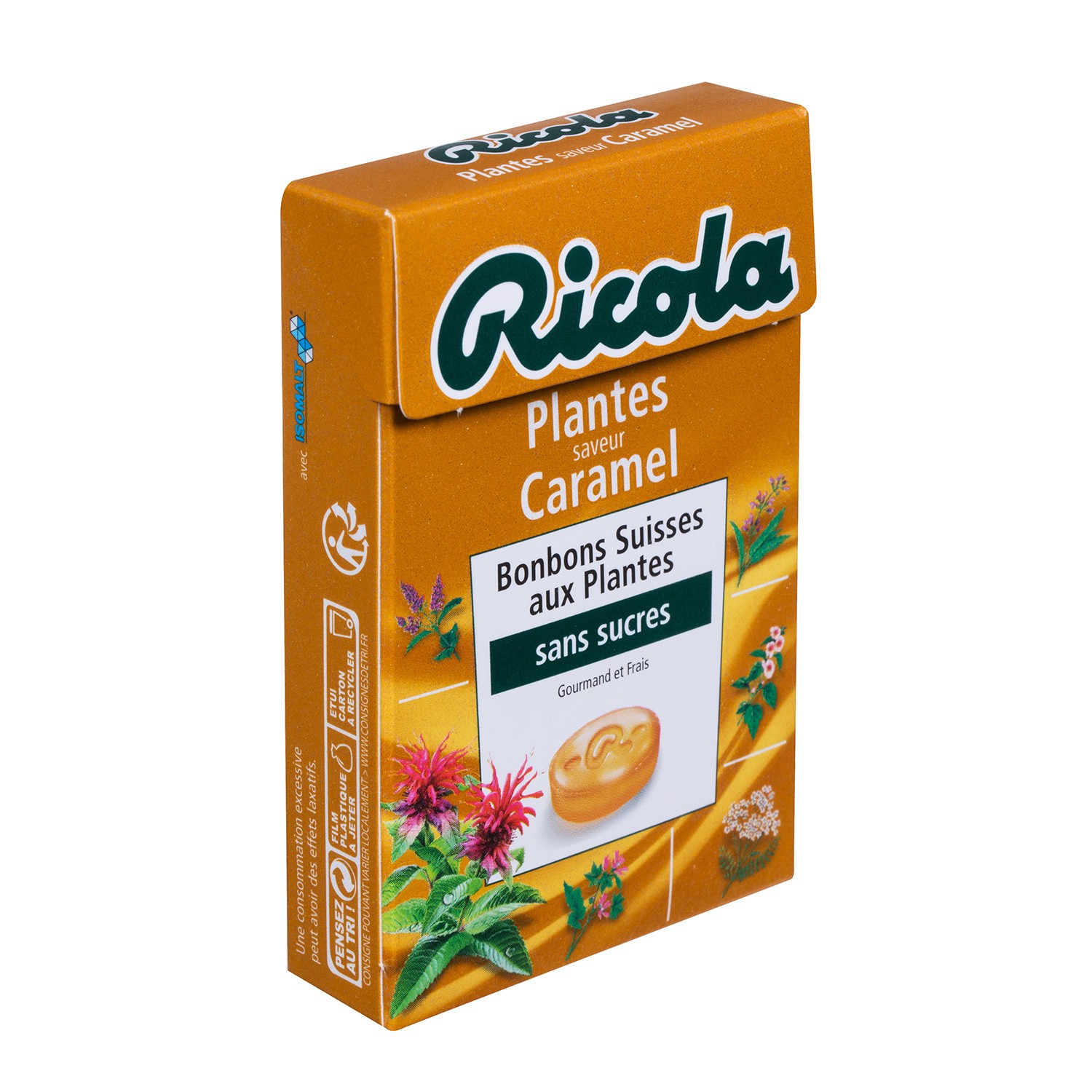 Bonbons Plantes saveur caramel. Ingrédients : édulcorant (isomalt), extraits de mélisse d’or, menthe poivrée, rooibos et du mélange de 13 plantes Ricola (1,1%); _beurre_ concentré...