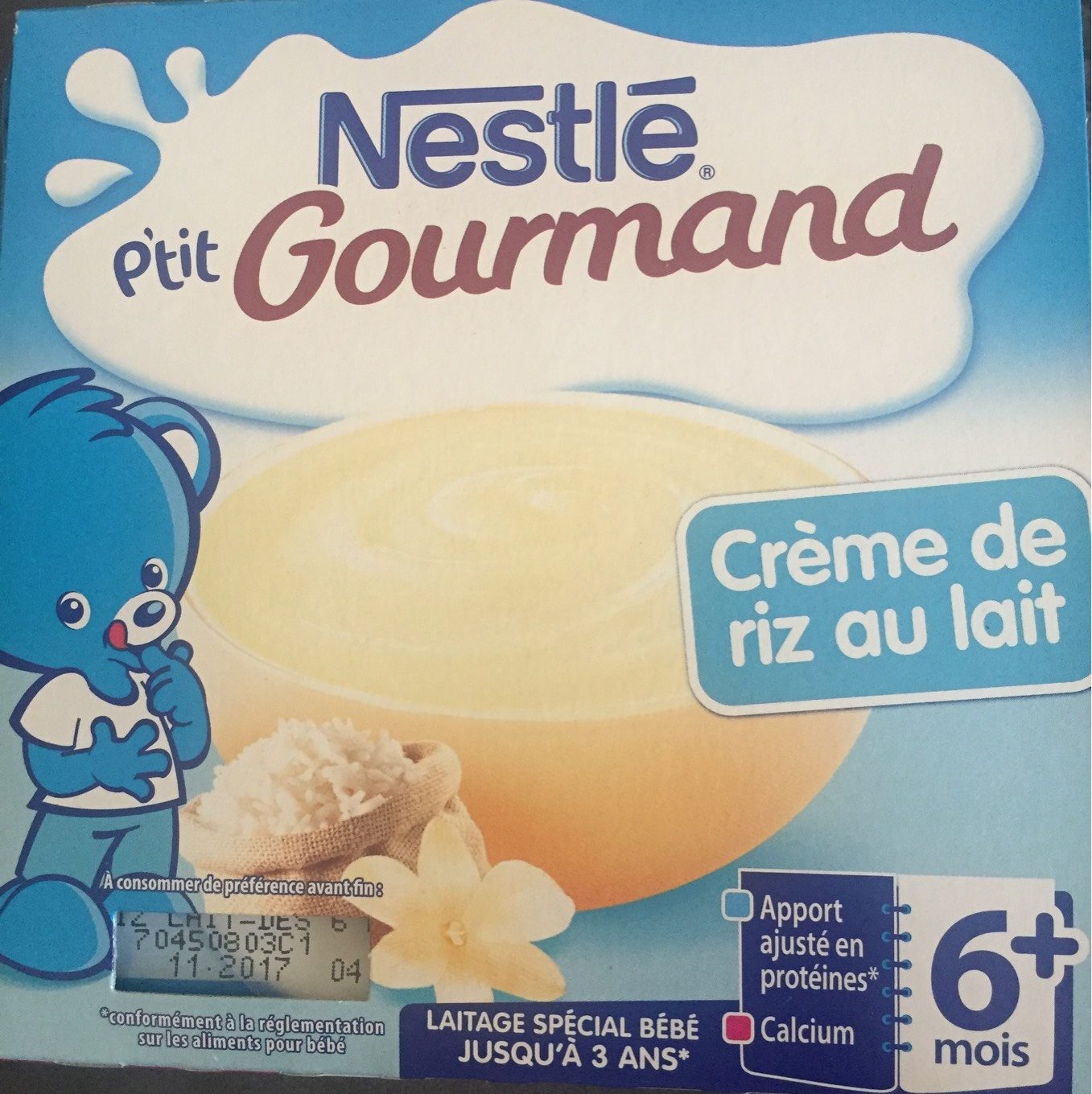 Pack 4X100G P'tit Gourmand Creme De Riz Nestle. Ingrédients : s Lait entier 90,6%, semoule de riz 4,5%, sucre, amidon transformé, concentré de minéraux du...