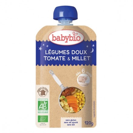 Purée de légumes et millet bio. Ingrédients : Légumes* 68% (maïs doux d'Aquitaine* 18%, purée de tomates d'Italie* 16%, pommes de terre de France* 14%,...