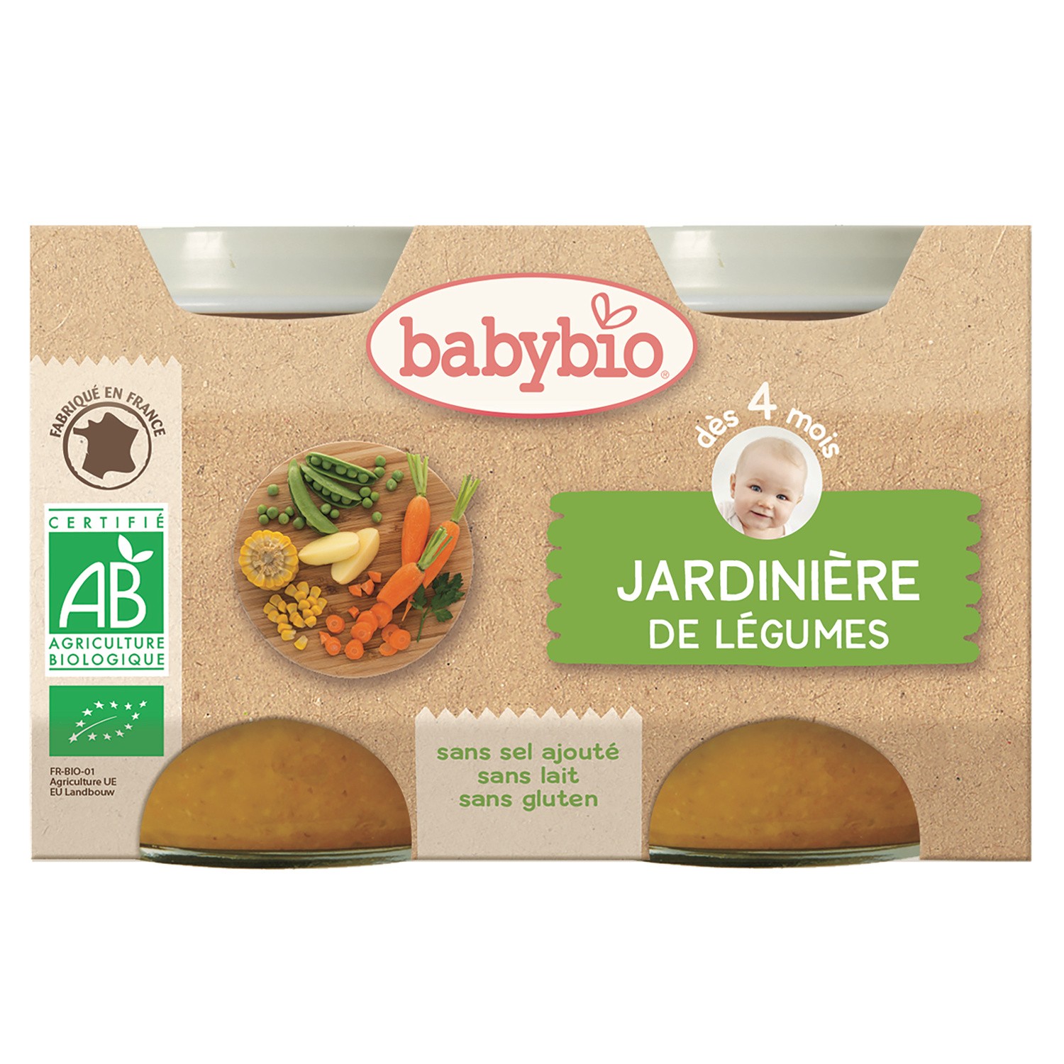 Jardinière de légumes, dès 4 mois, certifié AB. Ingrédients : Maïs doux d'aquitaine* 30%, petits pois d'Espagne* 23%, carottes des Landes* 23%, eau de cuisson,...