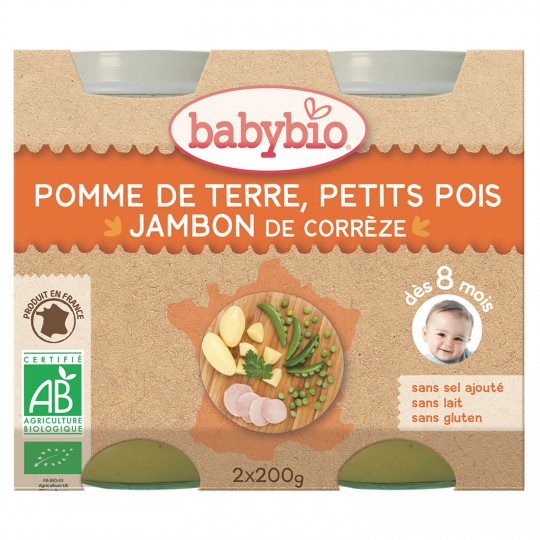Petits Pots Pomme deTerre, Petits Pois & Jambon de France. Ingrédients : Légumes 68% (pommes de terre du Val de Loire 25%, petits pois d'Espagne...