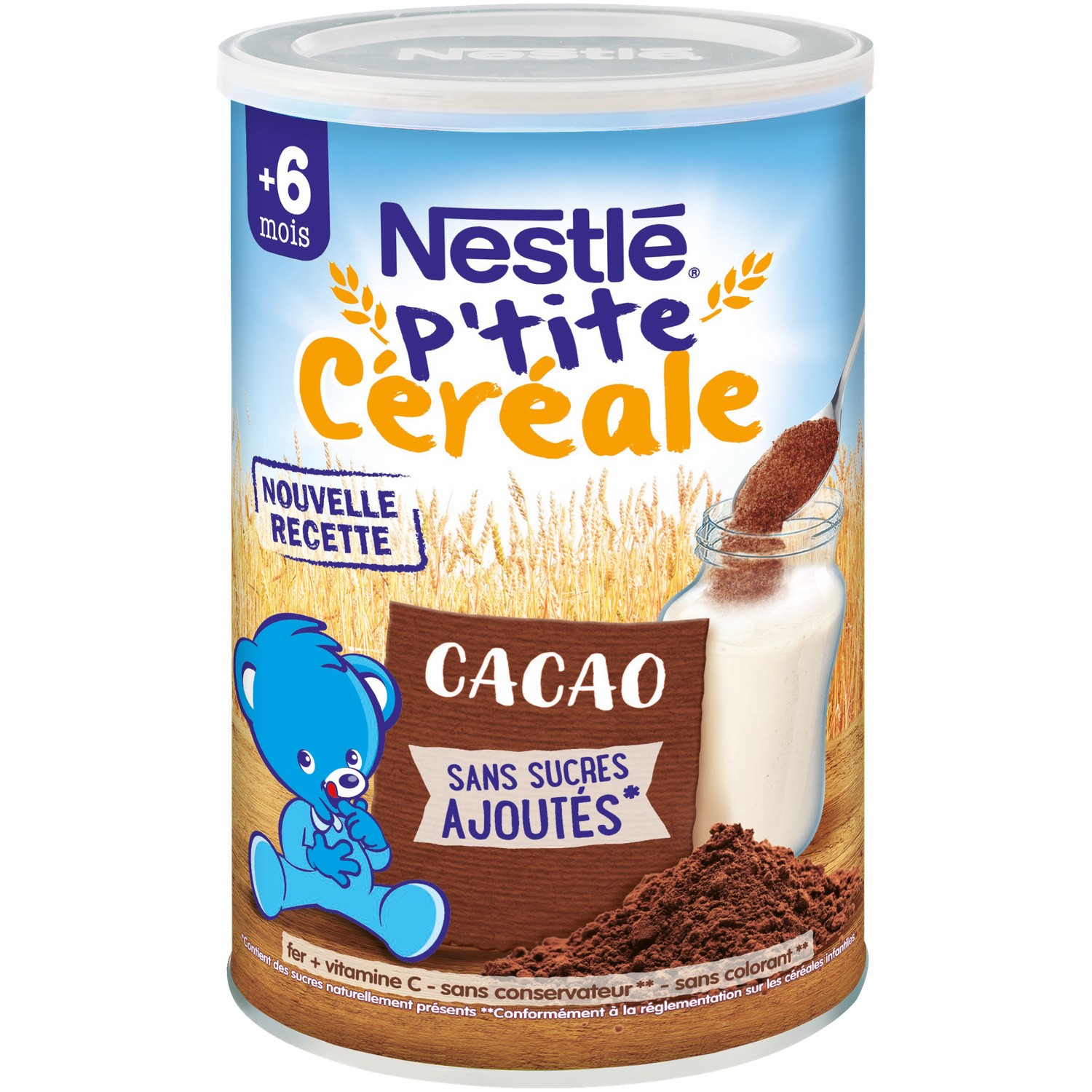 P'tite céréale cacao. Ingrédients : Céréales (92%) (farine de blé diastasée, de blé, de sorgho, de riz, de maïs, d'orge, de millet, de seigle, farine...