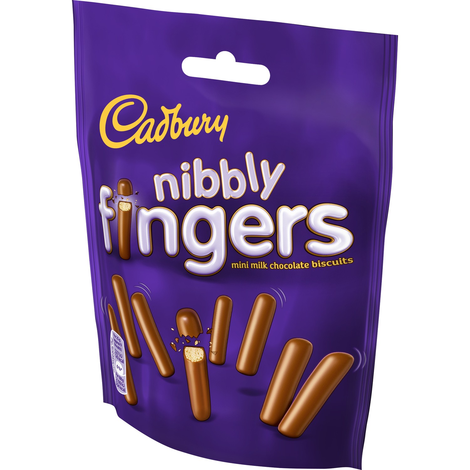 Nibbly fingers. Ingrédients : Farine de blé (enrichie en carbonate de calcium, fer élémentaire, niacine et thiamine), sucre, huiles vėgétales (palme, colza), beurre de cacao,...