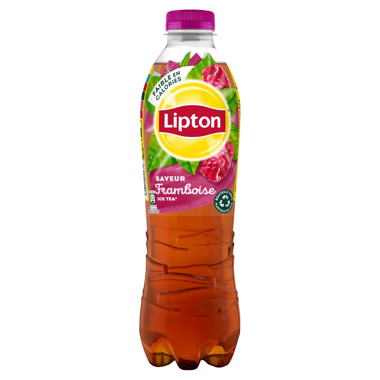 Ice tea framboise. Ingrédients : eau, sucre, acidifiant (acide citrique), extrait de thé (1 ,2g/l), jus de framboise à base de concentré (0,1 %), arômes,...