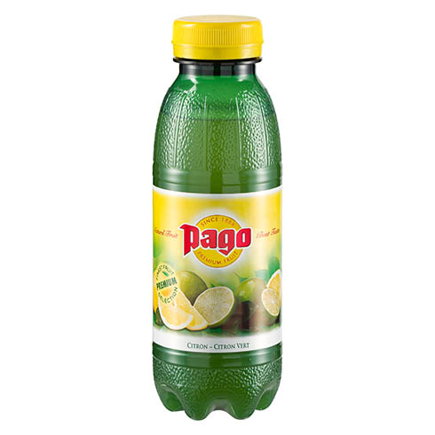 Blle Pet 33CL Pago Citron / Citron Vert Pago. Ingrédients : eau, jus à base de concentrés dei citron (8,5%), citron vert (5%), orange et...